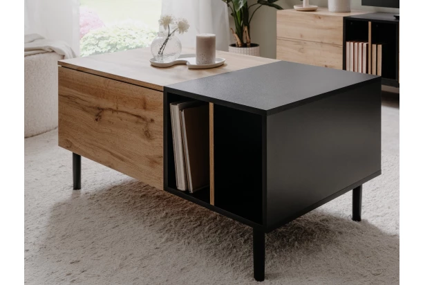 Konferenčný stolík s praktickým úložným priestorom, ktorý je ukrytý za bočnými dvierkami. Do otvorených priehradiek môžete odkladať knižky, časopisy, drobnosti alebo napríklad diaľkové ovládače. Tento stolík je nielen veľmi praktický, ale má aj zaujímavý moderný dizajn v kombinácii čiernych plôch a drevodekoru dub artisan.