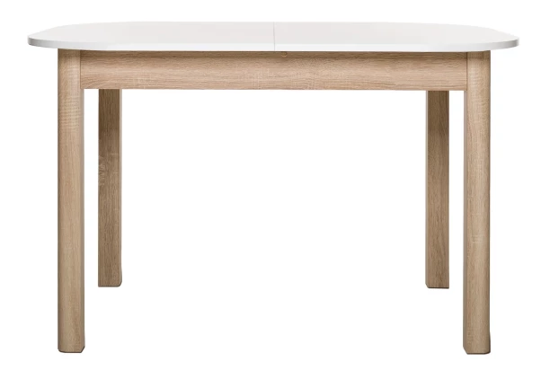Jedálenský stôl v kombinácii dub sonoma/biely má veľkosť 120×90 cm a elegantný dizajn so zaoblenými tvarmi jedálenskej dosky. Vďaka praktickej rozkladacej funkcii je možné ľahko rozšíriť na dĺžku 160 cm.