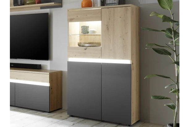 Presklená skrinka z programu Lille – nábytok v modernom minimalistickom štýle pôsobí nadčasovo v každom interiéri. Vyrobený v kombinácii dub artisan s antracitovými plochami. Priamočiare línie nábytku navyše zvýrazňuje zabudované podhľadové LED osvetlenie, ktoré dotvára príjemnú večernú atmosféru vo vnútri miestnosti. Vrátane bodového osvetlenia vo vnútri presklenej časti.