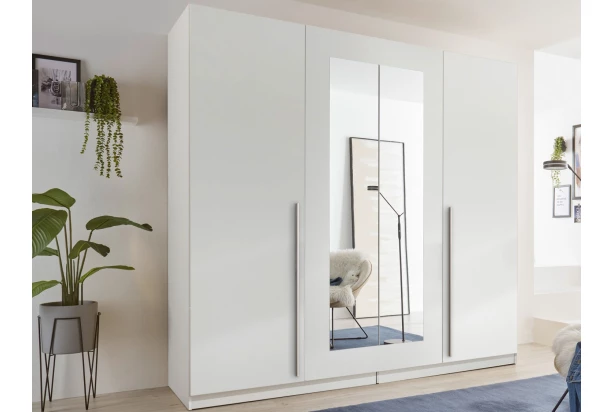Šatníková skriňa so šírkou 228 cm má 4 otočné dvere a uprostred zrkadla, ktorá opticky zväčší priestor vo vnútri miestnosti. Skriňa je vyrobená v bielej farbe a vďaka jednoducho modernému štýlu sa hodí nielen do spálne, ale aj do priestoru chodby alebo napríklad predsiene. Vnútri skrine nájdete police aj šatníkovú tyč na zavesenie ošatenia.