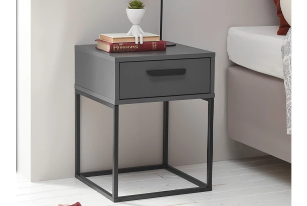 Nočný stolík na modernej podnoži z čierneho kovu je vybavený 1 zásuvkou a pôsobí v priestore spálne vzdušne. Skvelo pasuje k ďalšiemu modernému nábytku a doplnkom vo vašom interiéri. Vyrobený vo farbe grafitová tmavo šedá.