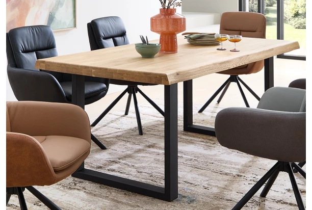 Jedálenský stôl z masívneho dubového dreva s veľkosťou 180×100 cm je originálnym spojením prírodnej krásy a moderného dizajnu. Dominantným prvkom sú zámerne zvlnené hrany stolovej dosky, ktoré podčiarkujú prirodzenosť dreva a vďaka ktorým vynikne efekt masivity. Jedálenský stôl je usadený na robustnej čiernej kovovej podnoži v tvare písmena U, ktorá stolu dodáva moderný industriálny nádych. Kovová konštrukcia zaisťuje vysokú stabilitu a pevnosť, takže stôl obstojí pri každodennom používaní aj pri väčších rodinných stretnutiach. Spojenie zvlnených prírodných hrán, masívneho duba a pevnej kovovej podnože vytvára harmonický kontrast medzi surovosťou prírody a čistotou moderného dizajnu. Tento stôl sa stane výrazným a nadčasovým centrom každej jedálne.