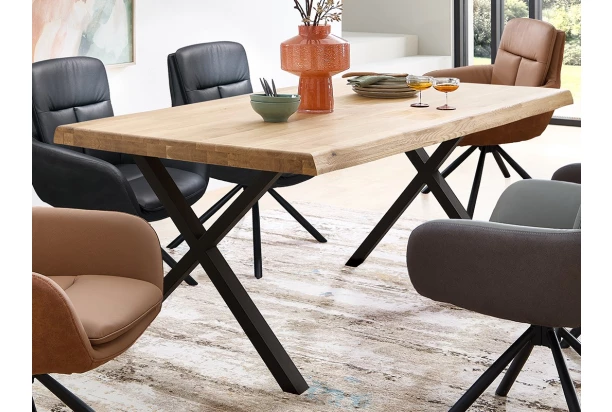 Jedálenský stôl z masívneho dubového dreva s veľkosťou 180×100 cm je originálnym spojením prírodnej krásy a moderného dizajnu. Dominantným prvkom sú zámerne zvlnené hrany stolovej dosky, ktoré podčiarkujú prirodzenosť dreva a vďaka ktorým vynikne efekt masivity. Jedálenský stôl je usadený na robustnej čiernej kovovej podnoži v tvare písmena X, ktorá stolu dodáva moderný industriálny nádych. Kovová konštrukcia zaisťuje vysokú stabilitu a pevnosť, takže stôl obstojí pri každodennom používaní aj pri väčších rodinných stretnutiach. Spojenie zvlnených prírodných hrán, masívneho duba a pevnej kovovej podnože vytvára harmonický kontrast medzi surovosťou prírody a čistotou moderného dizajnu. Tento stôl sa stane výrazným a nadčasovým centrom každej jedálne.