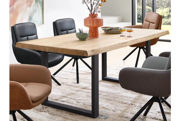 Jedálenský stôl z masívneho dubového dreva s veľkosťou 200×100 cm je originálnym spojením prírodnej krásy a moderného dizajnu. Dominantným prvkom sú zámerne zvlnené hrany stolovej dosky, ktoré podčiarkujú prirodzenosť dreva a vďaka ktorým vynikne efekt masivity. Jedálenský stôl je usadený na robustnej čiernej kovovej podnoži v tvare písmena U, ktorá stolu dodáva moderný industriálny nádych. Kovová konštrukcia zaisťuje vysokú stabilitu a pevnosť, takže stôl obstojí pri každodennom používaní aj pri väčších rodinných stretnutiach. Spojenie zvlnených prírodných hrán, masívneho duba a pevnej kovovej podnože vytvára harmonický kontrast medzi surovosťou prírody a čistotou moderného dizajnu. Tento stôl sa stane výrazným a nadčasovým centrom každej jedálne.