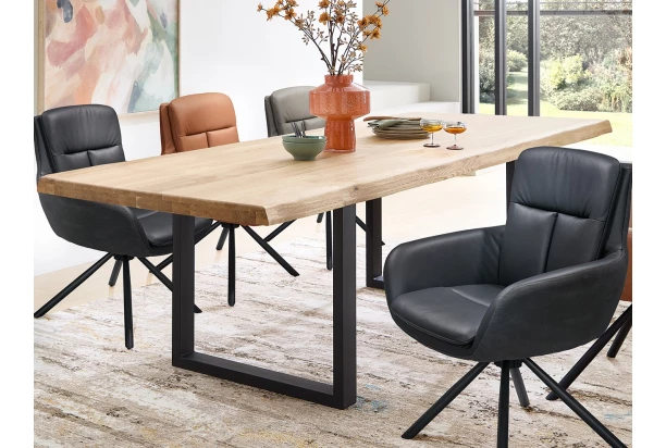 Jedálenský stôl z masívneho dubového dreva s veľkosťou 240×100 cm je originálnym spojením prírodnej krásy a moderného dizajnu. Dominantným prvkom sú zámerne zvlnené hrany stolovej dosky, ktoré podčiarkujú prirodzenosť dreva a vďaka ktorým vynikne efekt masivity. Jedálenský stôl je usadený na robustnej čiernej kovovej podnoži v tvare písmena U, ktorá stolu dodáva moderný industriálny nádych. Kovová konštrukcia zaisťuje vysokú stabilitu a pevnosť, takže stôl obstojí pri každodennom používaní aj pri väčších rodinných stretnutiach. Spojenie zvlnených prírodných hrán, masívneho duba a pevnej kovovej podnože vytvára harmonický kontrast medzi surovosťou prírody a čistotou moderného dizajnu. Tento stôl sa stane výrazným a nadčasovým centrom každej jedálne.