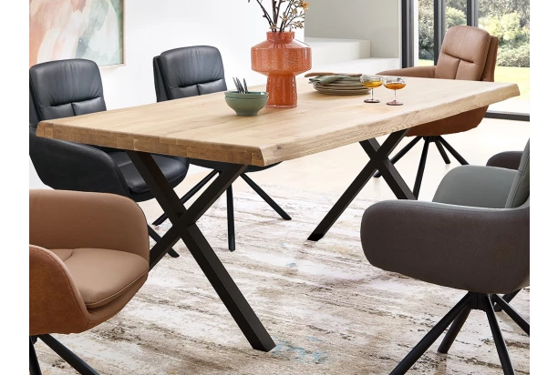 Jedálenský stôl z masívneho dubového dreva o veľkosti 200×100 cm je originálnym spojením prírodnej krásy a moderného dizajnu. Dominantným prvkom sú zámerne zvlnené hrany stolovej dosky, ktoré podčiarkujú prirodzenosť dreva a vďaka ktorým vynikne efekt masivity. Jedálenský stôl je usadený na robustnej čiernej kovovej podnoži v tvare písmena X, ktorá stolu dodáva moderný industriálny nádych. Kovová konštrukcia zaisťuje vysokú stabilitu a pevnosť, takže stôl obstojí pri každodennom používaní aj pri väčších rodinných stretnutiach. Spojenie zvlnených prírodných hrán, masívneho duba a pevnej kovovej podnože vytvára harmonický kontrast medzi surovosťou prírody a čistotou moderného dizajnu. Tento stôl sa stane výrazným a nadčasovým centrom každej jedálne.