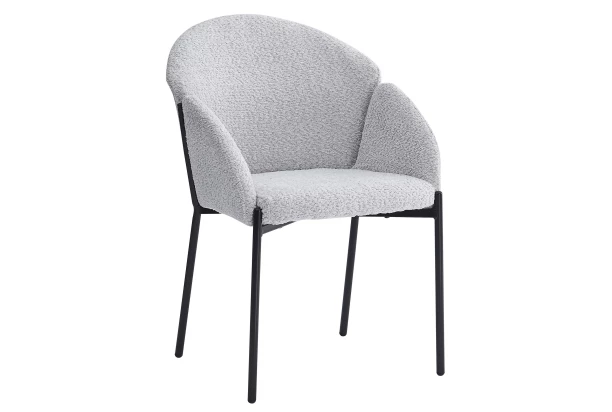 Moderná jedálenská stolička na čiernej kovovej podnoži má zaujímavý zaoblený dizajn a v priestore jedálne pôsobí veľmi elegantne. Stolička je očalúnená mäkkučkou štruktúrovanou látkou vo farbe svetlo šedá.