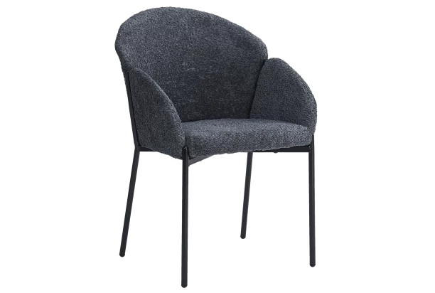 Moderná jedálenská stolička na čiernej kovovej podnoži má zaujímavý zaoblený dizajn av priestore jedálne pôsobí veľmi elegantne. Stolička je očalúnená mäkkučkou štruktúrovanou látkou vo farbe dymovo šedá.