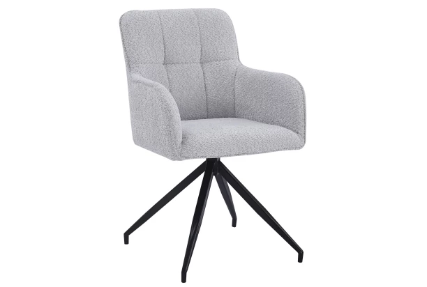 Moderná jedálenská stolička na čiernej kovovej podnoži má tvar pohodlného kresielka. Je očalúnená príjemne mäkkou štruktúrovanou látkou vo farbe svetlo šedá.