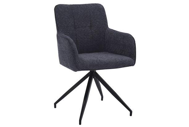 Moderná jedálenská stolička na čiernej kovovej podnoži má tvar pohodlného kresielka. Je očalúnená príjemne mäkkou štruktúrovanou látkou vo farbe tmavo šedá