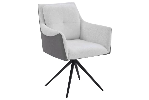 Moderná otočná jedálenská stolička na čiernej kovovej podnoži mám tvar kresielka a pôsobí luxusne. Očalúnená kombináciou šedá ekokoža/krémová mäkká štruktúrovaná látka.