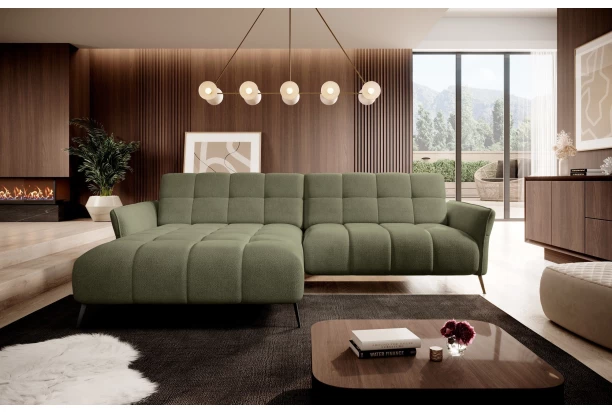 Moderná rohová sedačka s komfortným sedením tvorí ľavý roh a je očalúnená mäkkou žinilkovou látkou s dlhším lesklým vlasom vo farbe olivovo zelená, ktorá vyzerá veľmi luxusne. Oceníte kvalitnú penovú výplň, ktorá poskytuje príjemne mäkké pohodlie. Každodenný komfort dopĺňajú polohovateľné bočné podrúčky a predovšetkým sedák s elektrickým polohovaním – pomocou tlačidiel si tak ľahko prispôsobíte hĺbku sedu podľa aktuálnej potreby, prípadne si vytvoríte miesto na pohodovú relaxáciu alebo priestor na príležitostné spanie. Moderný dizajn sedačky podčiarkuje výrazné prešívanie a čierne kovové nohy, vďaka ktorým je sedačka stabilná a zároveň pôsobí v interiéri vzdušným dojmom.