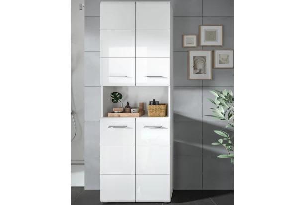 Vysoká skrinka s priehradkou z programu Ice – čisto biely nábytok s lesklými prednými plochami a elegantným zaoblením hrán pôsobí nadčasovo a je úplne univerzálny pre vybavenie každej modernej kúpeľne, prípadne aj akejkoľvek inej miestnosti. Skrinka obsahuje otvorenú odkladaciu priehradku a 4 otočné dvere, za ktorými nájdete úložné priestory s výškovo nastaviteľnými policami. Solídne spracovanie a materiály sú vhodné na používanie vo vlhkom prostredí kúpeľne, čo zaručuje dlhú životnosť, povrchy nábytku sa navyše ľahko udržujú a čistia. Táto biela vysoká skrinka sa hodí takmer do každej kúpenej. Využiť ju môžete ale aj kdekoľvek inde vo vnútri Vášho bytu.