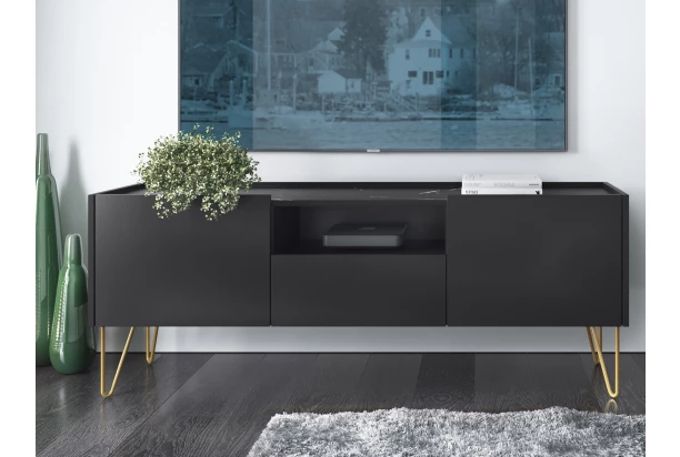TV skrinka z kolekcie Harmony – moderný čierny nábytok dopĺňa horná plocha v imitácii čierneho mramoru a zaoblená zlatá podnož, vďaka ktorej pôsobí nábytok veľmi elegantným a noblesným dojmom. Televízna skrinka so šírkou 144 cm tak zaujme v interiéri na pohľad a zároveň prakticky poslúži. Vďaka zvýšenej podnoží môžete ľahko využiť počas upratovania aj robotický vysávač.