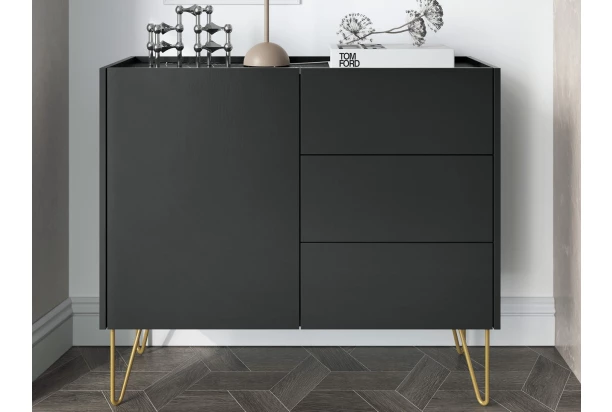 Komoda z kolekcie Harmony – moderný čierny nábytok je doplnený vrchnou plochou v imitácii čierneho mramoru a zaobleným zlatým podstavcom, vďaka čomu nábytok pôsobí veľmi elegantne a rafinovane. 97 cm široká úložná skrinka bude v interiéri pútavá a zároveň praktická. Vďaka vyvýšenému podstavcu môžete počas upratovania ľahko používať aj robotický vysávač.