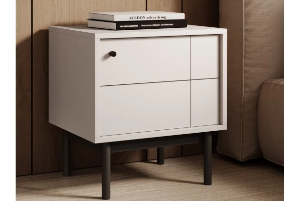 Nočný stolík / skrinka z kolekcie Japandi – priamočiare línie dopĺňa decentný geometrický vzor na predných plochách, ktorý podčiarkuje moderný charakter tohto nábytku. V prevedení béžový kašmír pôsobí nábytok v interiéri príjemne svetlým dojmom. Čierna podnož dodáva nábytku vzdušnosť a zároveň umožňuje jednoduchú údržbu podlahy. Nočný stolík so šírkou 54 cm môžete využiť nielen vedľa postele, ale aj ako malú úložnú skrinku na malé veci napríklad v obývačke alebo aj inde.