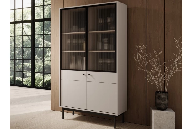 Vysoká vitrína z kolekcie Japandi – priamočiarej línie dopĺňa decentný geometrický vzor na predných plochách, ktorý podčiarkuje moderný charakter tohto nábytku. V prevedení béžový kašmír pôsobí nábytok v interiéri príjemne svetlým dojmom. Čierna podnož dodáva nábytku vzdušnosť a zároveň umožňuje jednoduchú údržbu podlahy. Táto vysoká vitrínová skrinka so šírkou 104 cm má 2 klasické otočné dvere a 2 dvere z polopriehľadného štruktúrovaného skla, kam môžete ukladať knižky, časopisy, dekorácie alebo veci, ktoré chcete mať po ruke.