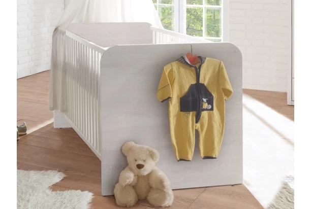 Detská postieľka s rozmermi lôžka 70×140 cm z kolekcie Luca v elegantnom štýle. Vyrobená v dekore bielenej pínie, ktorý imituje drevo s bieleným náterom. Vrátane výškovo nastaviteľného roštu.