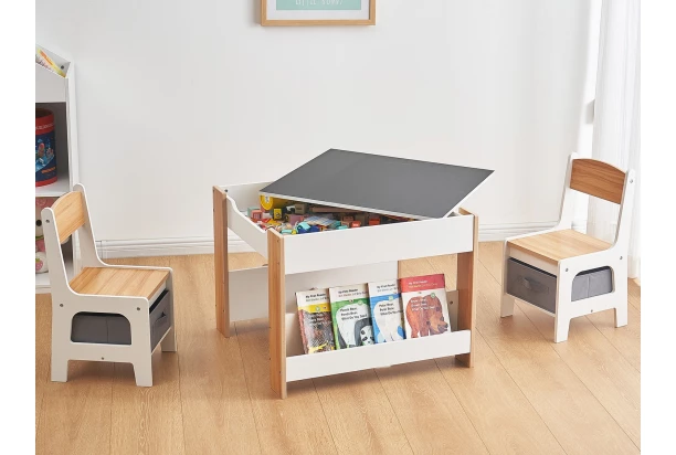 Roztomilá zostava detského nábytku obsahuje celkom 3 diely. Dve stoličky s úložnými boxmi a úložný stolík, kam uschováte napríklad pastelky, zošity, knižky, kocky a ďalšie drobné hračky. Tento malý nábytok pre deti sa zmestí do každej detskej izbičky.