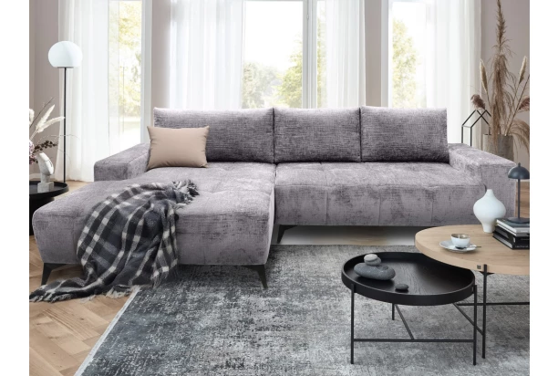 Moderná rohová sedačka je priestranná a má komfortne mäkké sedenie. Sedačka s otomanom tvorí ľavý roh a je očalúnená mäkkou štruktúrovanou látkou so zamatovo lesklým efektom vo farbe holubia šedá – atraktívna poťahová látka navyše pôsobí luxusne. Zaujme štýlovým prešitím sedadla aj bočných podrúčiek. Čierne kovové nohy v modernom dizajne uľahčia údržbu podlahy pod sedačkou. Rohová sedacia súprava je vybavená rozkladacou funkciou a praktickým úložným priestorom pod sedákom, kam môžete ukladať napríklad deky alebo veci sezónnej potreby.