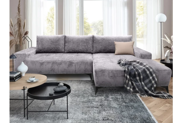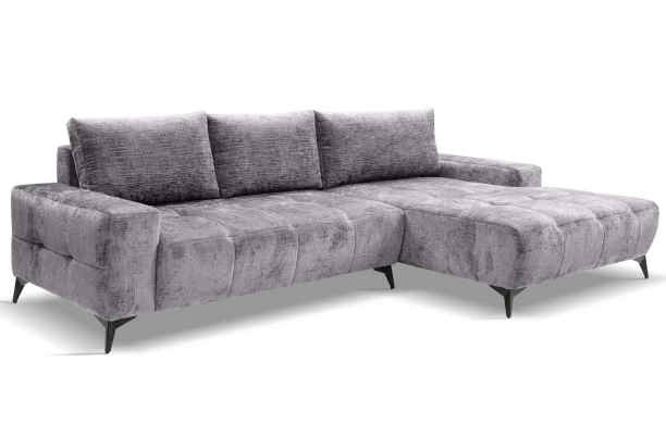 Moderná rohová sedačka je priestranná a má komfortne mäkké sedenie. Sedačka s otomanom tvorí pravý roh a je očalúnená mäkkou štruktúrovanou látkou so zamatovo lesklým efektom vo farbe holubia šedá – atraktívna poťahová látka navyše pôsobí luxusne. Zaujme štýlovým prešitím sedadla aj bočných podrúčiek. Čierne kovové nohy v modernom dizajne uľahčia údržbu podlahy pod sedačkou. Rohová sedacia súprava je vybavená rozkladacou funkciou a praktickým úložným priestorom pod sedákom, kam môžete ukladať napríklad deky alebo veci sezónnej potreby.