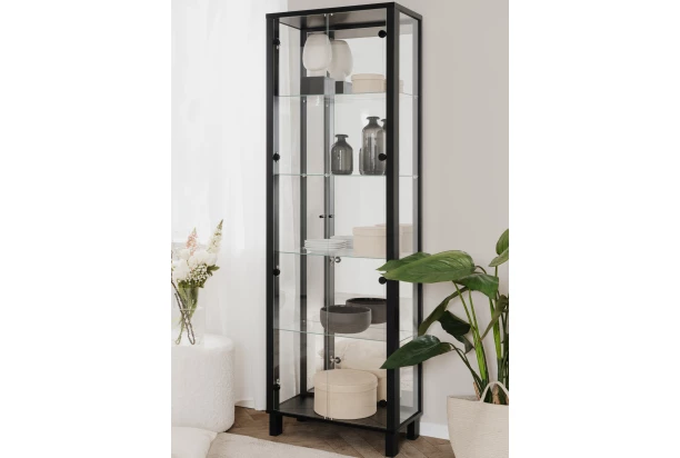 Vysoká vitrína v čiernej farbe so šírkou 62 cm má sklenené dvere aj bočné strany – ponúka vám tak priestor na veľkolepé vystavenie vašich obľúbených predmetov, dekorácií, fotiek, šperkov alebo napríklad obľúbeného jedálenského servisu. Vnútorná chrbtová plocha vitríny je vybavená zrkadlom, ktoré vytvára luxusný efekt a zároveň opticky zväčšuje okolitý priestor. Vnútorný priestor je vybavený policami zo skla. Vitrína má stabilnú konštrukciu a zároveň pôsobí v interiéri vzdušným dojmom. Táto vitrína skvele doplní napríklad obývaciu izbu, jedáleň alebo napríklad chodbu, kde upúta na pohľad.