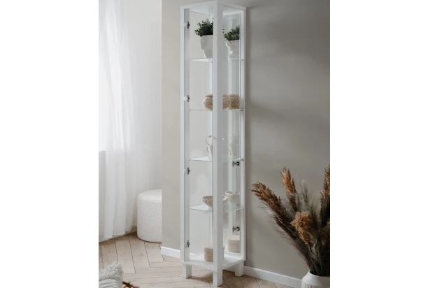 Vysoká a zároveň úzka vitrína v bielej farbe so šírkou 33 cm má sklenené dvere aj bočné strany – ponúka vám tak priestor na veľkolepé vystavenie vašich obľúbených predmetov, dekorácií, fotiek, šperkov alebo napríklad obľúbeného jedálenského servisu. Vnútorná chrbtová plocha vitríny je vybavená zrkadlom, ktoré vytvára luxusný efekt a zároveň opticky zväčšuje okolitý priestor. Vnútorný priestor je vybavený policami zo skla a dvere vitríny je možné univerzálne namontovať ako pravé alebo ľavé – vitrínu si tak ľahko prispôsobíte podľa vašich potrieb. Vitrína má stabilnú konštrukciu a zároveň pôsobí v interiéri vzdušným dojmom. Táto vitrína skvele doplní napríklad obývaciu izbu, jedáleň alebo napríklad chodbu, kde upúta na pohľad.