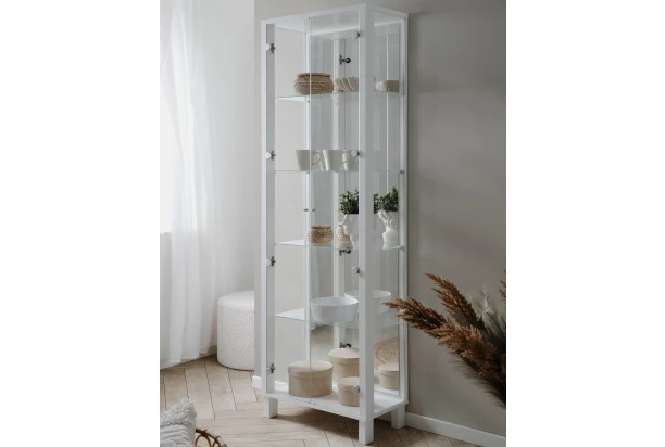 Vysoká vitrína v bielej farbe so šírkou 62 cm má sklenené dvere aj bočné strany – ponúka vám tak priestor na veľkolepé vystavenie vašich obľúbených predmetov, dekorácií, fotiek, šperkov alebo napríklad obľúbeného jedálenského servisu. Vnútorná chrbtová plocha vitríny je vybavená zrkadlom, ktoré vytvára luxusný efekt a zároveň opticky zväčšuje okolitý priestor. Vnútorný priestor je vybavený policami zo skla. Vitrína má stabilnú konštrukciu a zároveň pôsobí v interiéri vzdušným dojmom. Táto vitrína skvele doplní napríklad obývaciu izbu, jedáleň alebo napríklad chodbu, kde upúta na pohľad.