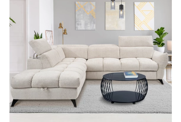 Atraktívna rohová sedačka má elegantne zaoblené tvary s výrazným prešitím, ktoré vytvára nadýchanú vankúšovú optiku. Komfortne mäkké sedenie dopĺňajú chrbtové opierky s funkciou polohovania podľa vašej aktuálnej potreby, ľahko si tak kedykoľvek prispôsobíte pohodlie podľa seba. Moderné kovové čierne nohy dotvárajú moderný dizajn a pôsobia vzdušným dojmom. Rohová sedacia súprava ponúka aj funkciu rozkladu na príležitostné spanie a navyše úložný priestor pod otomanom. Táto kvalitne vypolstrovaná sedačka s otomanom tvorí ľavý roh a je očalúnená mäkkou štruktúrovanou látkou vo farbe šedo-krémová, ktorá je kombináciou estetiky, pohodlia a funkčnosti – táto látka je nielen príjemne mäkká na dotyk, ale zároveň aj Pet friendly – teda odolná voči domácemu alebo poškriabaniu a inému mechanickému poškodeniu. maznáčikov.