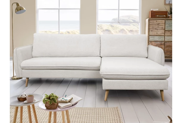 Pohodlná rohová sedačka s nohami z masívneho dreva pôsobí v interiéri veľmi útulne a ľahko ju môžete kombinovať s nábytkom vo svetlom odtieni dreva. Táto rohová sedacia súprava je možné univerzálne zostaviť ako pravý alebo ľavý roh. Rozmerovo menšia sedačka je ideálna aj do malého priestoru obývačky. Kombinácia zaoblených tvarov a dreva ľahko pasuje do mnohých interiérov – ako do interiéru v obľúbenom škandinávskom štýle, tak do všetkých klasicky alebo moderne zariadených bytov. Sedačka je očalúnená jemne štruktúrovanou látkou vo farbe krémová. Poťahová látka je príjemne mäkká a zároveň odolná – vyznačuje sa zvýšenou vodeodolnosťou.