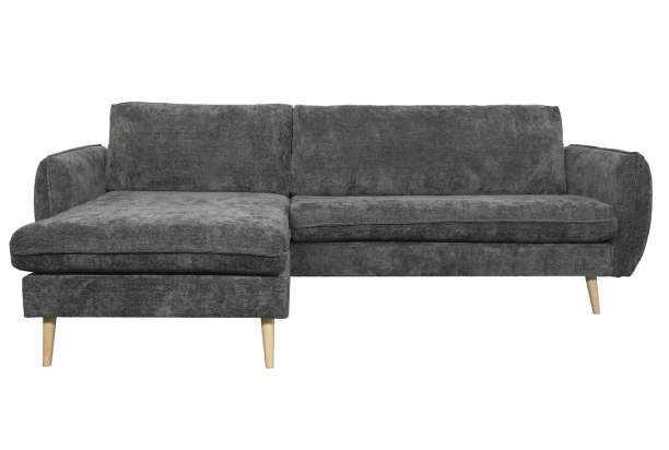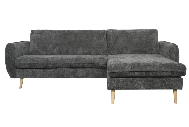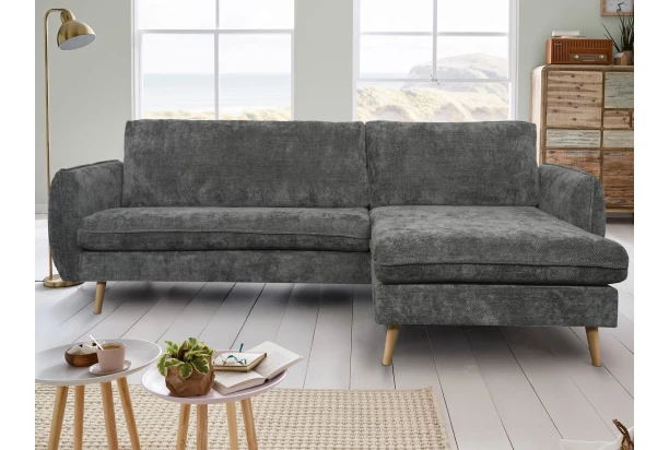 Pohodlná rohová sedačka s nohami z masívneho dreva pôsobí v interiéri veľmi útulne a ľahko ju môžete kombinovať s nábytkom vo svetlom odtieni dreva. Túto rohovú sedaciu súpravu je možné univerzálne zostaviť ako pravý alebo ľavý roh. Rozmerovo menšia sedačka je ideálna aj do malého priestoru obývačky. Kombinácia zaoblených tvarov a dreva ľahko pasuje do mnohých interiérov – ako do interiéru v obľúbenom škandinávskom štýle, tak do všetkých klasicky alebo moderne zariadených bytov. Sedačka je očalúnená zamatovo hebkou štruktúrovanou tkaninou vo farbe grafitová tmavo šedá.