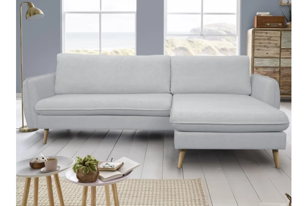 Pohodlná rohová sedačka s nohami z masívneho dreva pôsobí v interiéri veľmi útulne a ľahko ju môžete kombinovať s nábytkom vo svetlom odtieni dreva. Táto rohová sedacia súprava je možné univerzálne zostaviť ako pravý alebo ľavý roh. Rozmerovo menšia sedačka je ideálna aj do malého priestoru obývačky. Kombinácia zaoblených tvarov a dreva ľahko pasuje do mnohých interiérov – ako do interiéru v obľúbenom škandinávskom štýle, tak do všetkých klasicky alebo moderne zariadených bytov. Sedačka je očalúnená jemne štruktúrovanou látkou vo farbe svetlo šedá. Poťahová látka je príjemne mäkká a zároveň odolná – vyznačuje sa zvýšenou vodeodolnosťou.