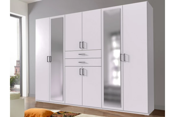 Šatníková skriňa so zrkadlami má celkovú šírku 270 cm, kontrastné čierne úchyty a je vyrobená vo farbe biela. Univerzálnym štýlom sa hodí do každej spálne, šatne alebo chodby. Táto skriňa obsahuje 8 otočných dverí, 2 zrkadlá a 2 zásuvky v komfortnej výške. Horná zásuvka má navyše praktické vnútorné členenie na prehľadné ukladanie drobnej bielizne alebo doplnkov. Vnútorný priestor vo vnútri skrine môžete navyše ľubovoľne doplniť ešte ďalšími policami podľa vašich potrieb. Bočnú konštrukciu skrine je možné navyše doplniť okrasným paspartovým rámom.