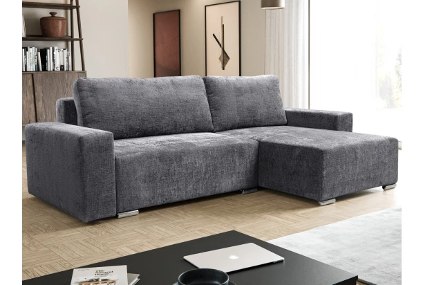 Pohodlná rozkladacia sedačka v nadčasovom štýle sa hodí do každého interiéru a ponúka dostatok priestoru pre Vašu každodennú pohodu. Rohová sedacia súprava je očalúnená látkou s jemnou povrchovou štruktúrou vo farbe tmavo šedá. Veľké oporné vankúše poskytujú pohodlie a zároveň oporu, po ich odobratí môžete pohovku využiť ako lôžko na príležitostné spanie alebo relaxáciu. Pod sedákom nájdete úložný priestor, kam môžete ukladať napríklad deky alebo veci sezónnej potreby.