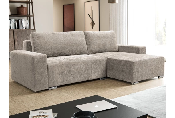 Pohodlná rozkladacia sedačka v nadčasovom štýle pasuje do každého interiéru a ponúka dostatok priestoru pre vašu každodennú pohodu. Rohová sedacia súprava je čalúnená látkou s jemnou povrchovou štruktúrou vo farbe béžová cappuccino. Veľké oporné vankúše poskytujú pohodlie a zároveň oporu, po ich odobratí môžete pohovku využiť ako lôžko na príležitostné spanie alebo relaxáciu. Po sedáku nájdete úložný priestor, kam môžete ukladať napríklad deky alebo veci sezónnej potreby.