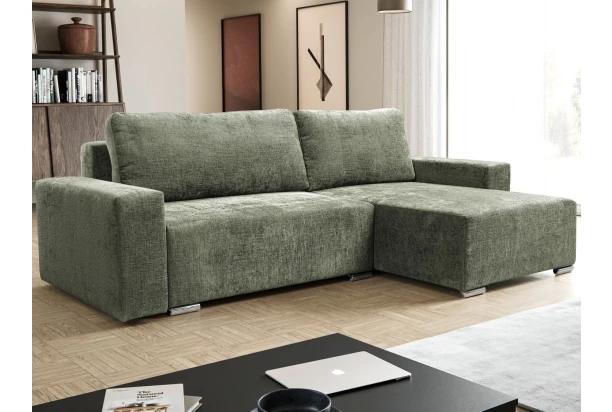 Pohodlná rozkladacia sedačka v nadčasovom štýle sa hodí do každého interiéru a ponúka dostatok priestoru pre Vašu každodennú pohodu. Rohová sedacia súprava je očalúnená látkou s jemnou povrchovou štruktúrou vo farbe machovo zelená. Veľké oporné vankúše poskytujú pohodlie a zároveň oporu, po ich odobratí môžete pohovku využiť ako lôžko na príležitostné spanie alebo relaxáciu. Pod sedákom nájdete úložný priestor, kam môžete ukladať napríklad deky alebo veci sezónnej potreby.