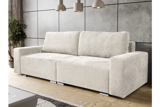 Pohodlná rozkladacia pohovka v nadčasovom štýle pasuje do každého interiéru a ponúka dostatok priestoru pre vašu každodennú pohodu. Očalúnená látkou s jemnou povrchovou štruktúrou vo farbe svetlo krémová. Veľké oporné vankúše poskytujú pohodlie a zároveň oporu, po ich odobratí môžete pohovku využiť ako lôžko na príležitostné spanie alebo relaxáciu. Po sedáku nájdete dva úložné priestory, kam môžete ukladať napríklad deky alebo veci sezónnej potreby.