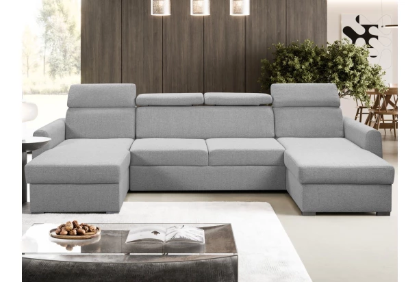Pohodlná sedacia súprava v tvare U sa rozmerovo hodí aj do menšej obývačky, kde ponúkne pohodlne mäkké sedenie s polohovateľnými opierkami hlavy. Sedačka je očalúnená odolnou látkou vo farbe svetlo šedá a má dva otomany, na ktorých môžete v pohode relaxovať alebo sledovať televíziu. Pod otomanmi nájdete praktické úložné priestory. Funkciu rozkladu na príležitostné spanie využijete pri odpočinku alebo napríklad vaša víkendová návšteva.
