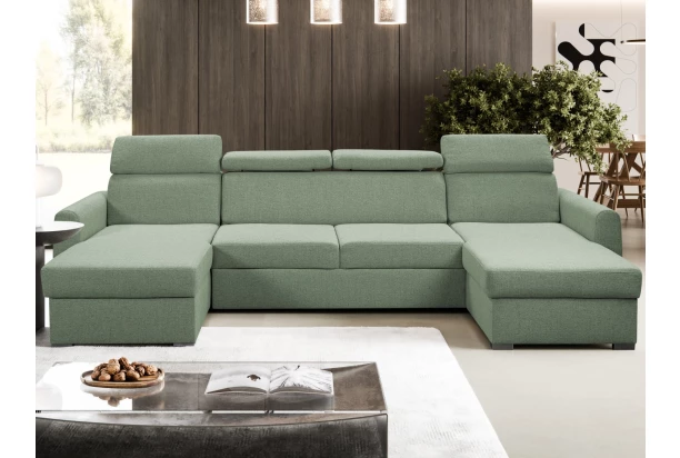 Pohodlná sedacia súprava v tvare U sa rozmerovo hodí aj do menšej obývačky, kde ponúkne pohodlne mäkké sedenie s polohovateľnými opierkami hlavy. Sedačka je očalúnená odolnou látkou vo farbe rákosovo zelená a má dva otomany, na ktorých môžete v pohode relaxovať alebo sledovať televíziu. Pod otomanmi nájdete praktické úložné priestory. Funkciu rozkladu na príležitostné spanie využijete pri odpočinku alebo napríklad vaša víkendová návšteva.