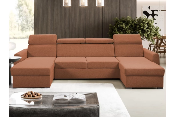 Pohodlná sedacia súprava v tvare U sa rozmerovo hodí aj do menšej obývačky, kde ponúkne pohodlne mäkké sedenie s polohovateľnými opierkami hlavy. Sedačka je očalúnená odolnou látkou vo farbe oranžovo-hnedá terracota a má dva otomany, na ktorých môžete v pohode relaxovať alebo sledovať televíziu. Pod otomanmi nájdete praktické úložné priestory. Funkciu rozkladu na príležitostné spanie využijete pri odpočinku alebo napríklad vaša víkendová návšteva.