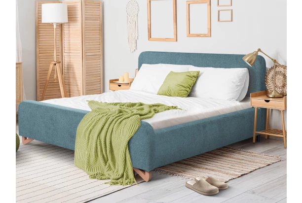 Elegantná posteľ o veľkosti lôžka 180×200 cm má zaoblený tvar čela a zaujímavé nohy z masívneho dreva, ktoré dotvárajú útulnú atmosféru v priestore spálne. Dvojlôžková posteľ má stabilnú konštrukciu a je očalúnená zamatovo hebkou štruktúrovanou tkaninou vo farbe morská modrá, ktorá sa zároveň vyznačuje zvýšenou odolnosťou.