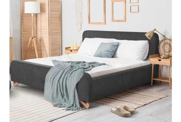 Elegantná posteľ o veľkosti lôžka 180×200 cm má zaoblený tvar čela a zaujímavé nohy z masívneho dreva, ktoré dotvárajú útulnú atmosféru v priestore spálne. Dvojlôžková posteľ má stabilnú konštrukciu a je očalúnená zamatovo hebkou štruktúrovanou tkaninou vo farbe grafitovo šedá, ktorá sa zároveň vyznačuje zvýšenou odolnosťou.