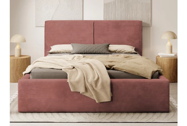 Posteľ o veľkosti lôžka 180×200 cm je očalúnená mäkkučkou štruktúrovanou látkou vo farbe terracota, ktorá pôsobí veľmi útulne. Čalúnenie zadného čela dopĺňajú okrasné látkové lemy. Táto dvojlôžková posteľ má stabilnú konštrukciu a svojim moderným štýlom sa hodí takmer do každej spálne.