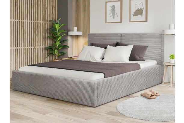 Posteľ o veľkosti lôžka 180×200 cm je očalúnená mäkkučkou štruktúrovanou látkou vo farbe svetlo šedá, ktorá pôsobí veľmi útulne. Čalúnenie zadného čela dopĺňajú okrasné látkové lemy. Táto dvojlôžková posteľ má stabilnú konštrukciu a svojim moderným štýlom sa hodí takmer do každej spálne.