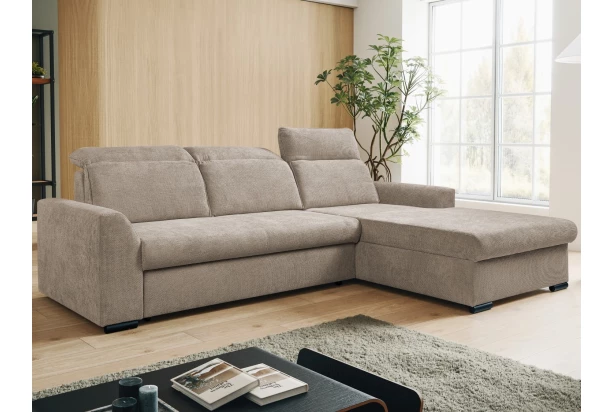 Komfortná rohová sedačka s polohovateľnými opierkami dokonale doplní priestor modernej obývačky. Očalúnená zamatovo hebkou štruktúrovanou tkaninou vo farbe béžová cappuccino. Sedacia súprava s otomanom tvorí pravý roh, pod otomanom nájdete praktický úložný priestor, kam môžete ukladať napríklad veci sezónnej potreby. Funkciu rozkladu na príležitostné lôžko využijete počas relaxácie alebo na prespanie vašej návštevy. Táto rohová sedačka o ideálnych rozmeroch bude pasovať dobre do akejkoľvek veľkej obývačky.
