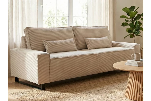 Moderná trojmiestna pohovka je očalúnená mäkkučkou štruktúrovanou látkou vo farbe krémová. Pohodlné sedenie na pohovke dopĺňajú veľké oporné vankúše aj bedrové vankúšiky, ktoré poskytujú komfort a zároveň oporu. Čierna kovová podnož umožňuje ľahkú údržbu podlahy a prípadne aj možnosť využitia robotického vysávača. Tento trojsedák sa hodí do akéhokoľvek klasického alebo moderne zariadeného interiéru.