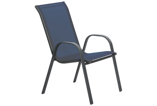 Pohodlne zaoblené záhradné kreslo má čiernu kovovú konštrukciu a sedák z odolnej umelej tkaniny vo farbe modrá. Poskytne tak príjemné pohodlie na záhrade, balkóne či terase.