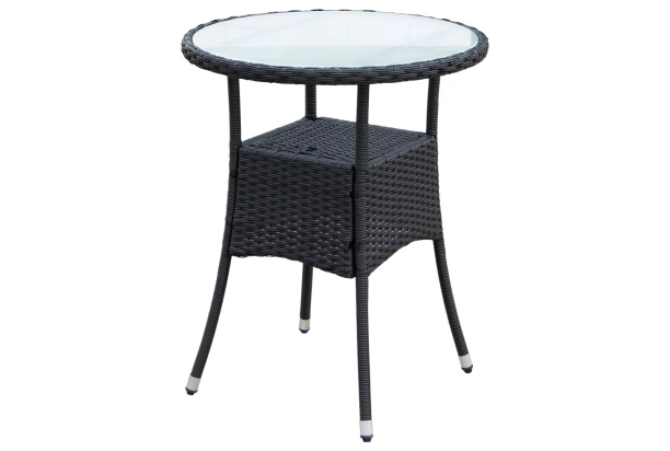 Okrúhly záhradný stolík s priemerom 60 cm z radu Alford – záhradný nábytok z obľúbenej kombinácie kovu a imitácie ratanu sa hodí takmer na akúkoľvek záhradu, terasu, balkón či dvor. Odolná imitácia ratanu v čiernom prevedení pôsobí veľmi elegantne – nábytok tak môžete využiť ako vonku na záhrade, tak aj vo vnútri bytu, napríklad aj v priestore zimnej záhrady. Vďaka svojim rozmerom je možné umiestniť aj do menšieho priestoru.