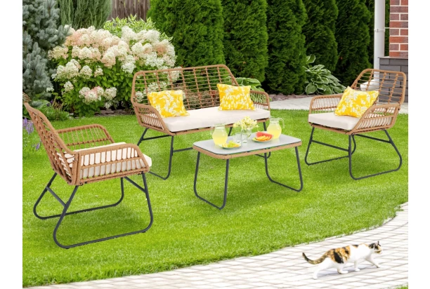 Útulný 4-dielny set záhradného nábytku z kovu a imitácie ratanu v prírodnej farbe má elegantný dizajn. Obsahuje obdĺžnikový konferenčný stolík, pohovku a dve pohodlné kreslá s vankúšmi. Ľahko si tak vytvoríte príjemné komfortné prostredie na záhrade, vonkajšej terase alebo balkóne.