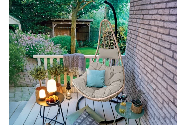 Závesné kreslo z kovu a prepletenej imitácie béžového ratanu bude vyzerať atraktívne na každej vonkajšej záhrade. Pohodlne mäkký vankúš poskytne pohodlie a Vy si tak budete môcť užívať pohodové ľahké hojdanie v prírode. Toto kresielko môžete umiestniť nielen na dvor alebo terasu, ale bude zaujímavo vyzerať aj napríklad v interiéri.